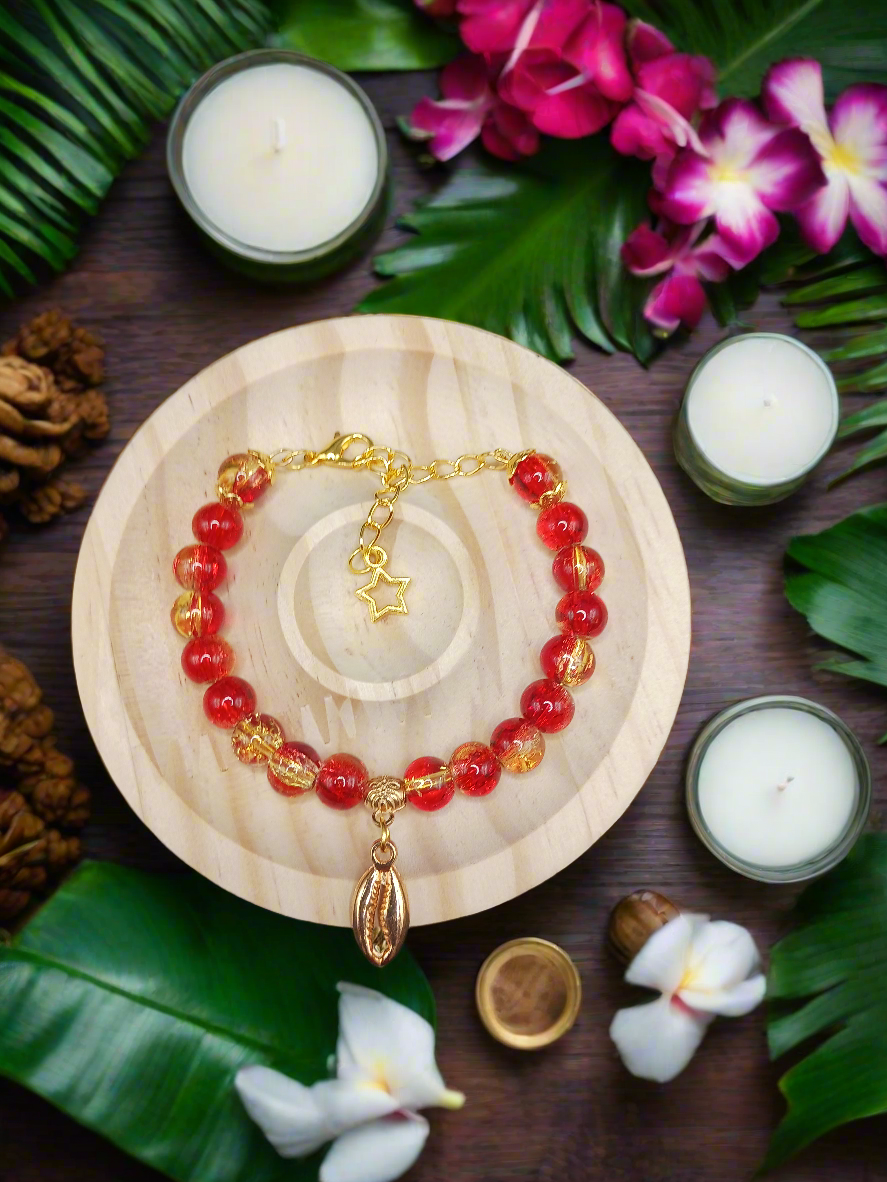 Introducing the Fiery Cory Shell bracelet, perfect for adding a touch of unique charm to any outfit. Featuring red and gold glass beads, a Cory shell charm, and a beautiful star charm on an adjustable chain. Expertly crafted with scientific precision, this piece is sure to make a statement.
